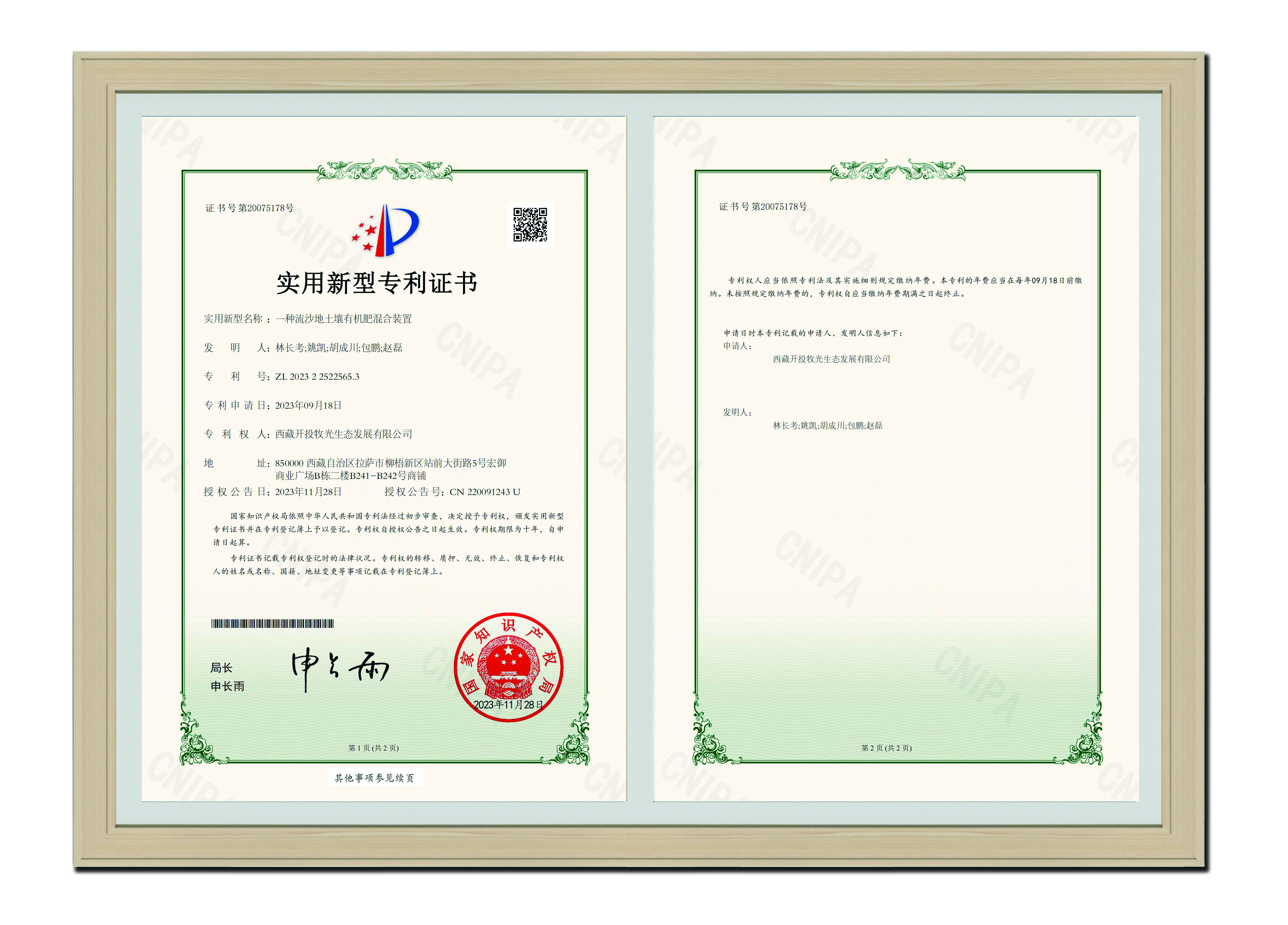 2023年11月28日 一種流沙地土壤有機肥混合裝置-實用新型專利證書-西藏開投牧光生態(tài)發(fā)展有限公司