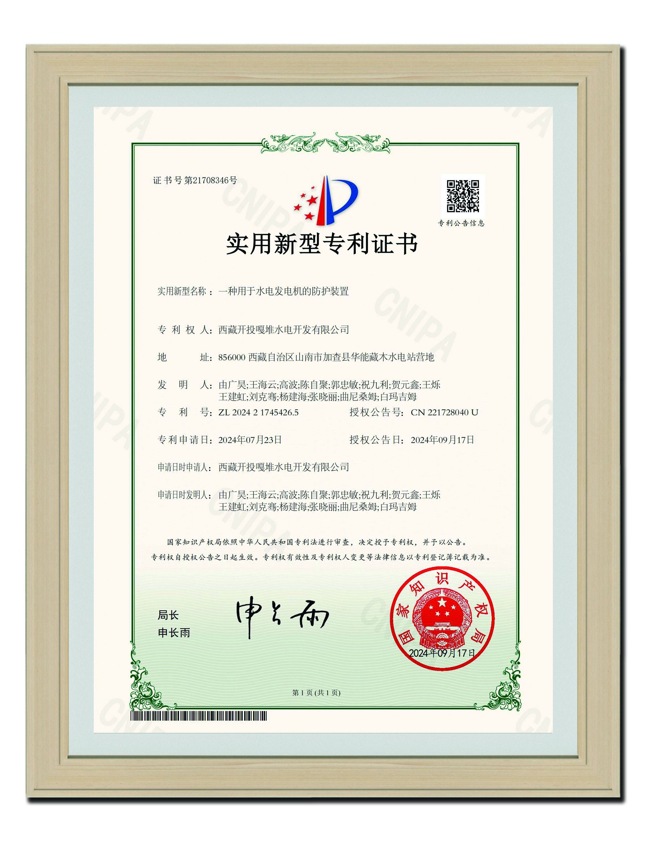 2024-09-17 實(shí)用新型專利證書_一種用于水電發(fā)電機(jī)的防護(hù)裝置