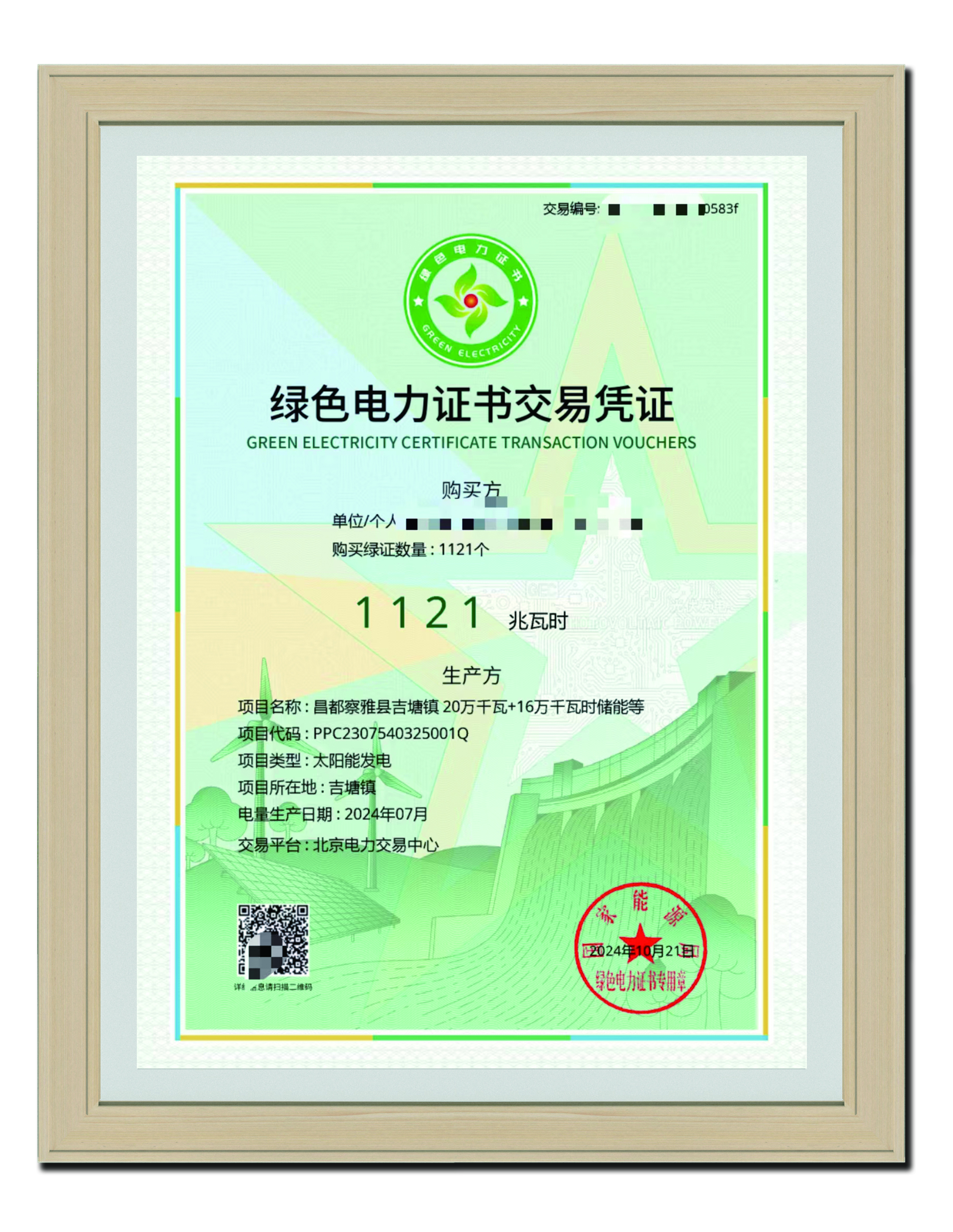 2024年10月21日 綠色電力證書(shū)交易憑證1121兆瓦時(shí)