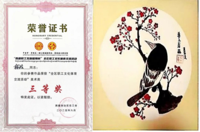 為深入學(xué)習(xí)習(xí)近平新時(shí)代中國(guó)特色社會(huì)主義思想,全面貫徹黨的二十大和二十屆二中、三中全會(huì)以及中國(guó)工會(huì)十八大精神,致敬百年工會(huì)歷程,慶祝西藏自治區(qū)成立60周年、中華全國(guó)總工會(huì)成立100周年,西藏自治區(qū)總工會(huì)于今年4月至6月在拉薩舉辦“中國(guó)夢(mèng)·勞動(dòng)美——凝心鑄魂跟黨走、團(tuán)結(jié)奮斗新征程”“西藏職工互助保障杯”全區(qū)職工文化體育交流活動(dòng),并于6月27日在西藏大學(xué)文化藝術(shù)中心舉行了盛大的頒獎(jiǎng)儀式。西藏開(kāi)投集團(tuán)工會(huì)會(huì)員林玲的作品《喜上眉梢》榮獲三等獎(jiǎng)。