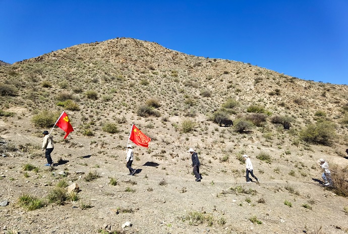 此次踏勘全程22公里,海拔垂直高度1200米。9時(shí)30分,新能源公司踏勘人員肩抗黨旗、國(guó)旗,背負(fù)測(cè)量設(shè)備和儀器從山腳沿項(xiàng)目進(jìn)場(chǎng)道路出發(fā)。在徒步上山過(guò)程中,天氣炙烤灼人,大家三五隨群,或健步直沖或駐足而立,或仔細(xì)測(cè)量或落筆記錄,或討論工作或抒懷暢想。大家互相幫助、互相鼓勁,隨著海拔的不斷攀升,身體負(fù)重不斷加大,氣息開(kāi)始急促、腳步不再有力,每前進(jìn)一步都特別的困難,但眼前的大山壯闊雄渾,遠(yuǎn)處的冰川雪景圣潔空靈,頭頂?shù)奶炜照克{(lán)纖塵不染,讓大家心曠神怡,真切感受到高度是一種境界,攀登是一種追求,是一種“小天下”的胸懷和氣魄!