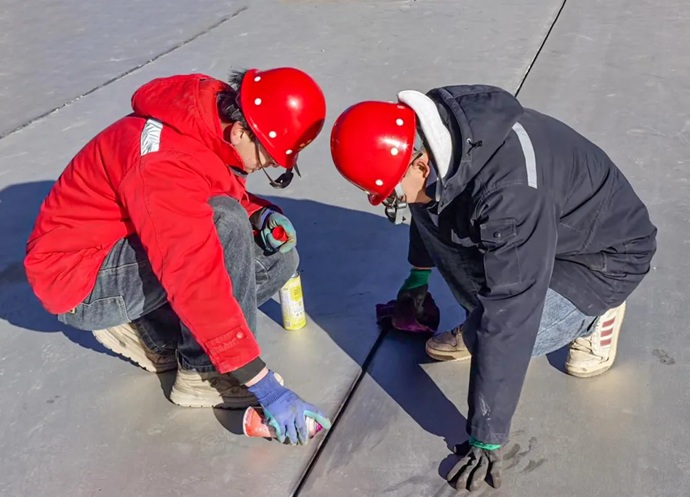 現(xiàn)場工人進行金屬板材接縫處理。