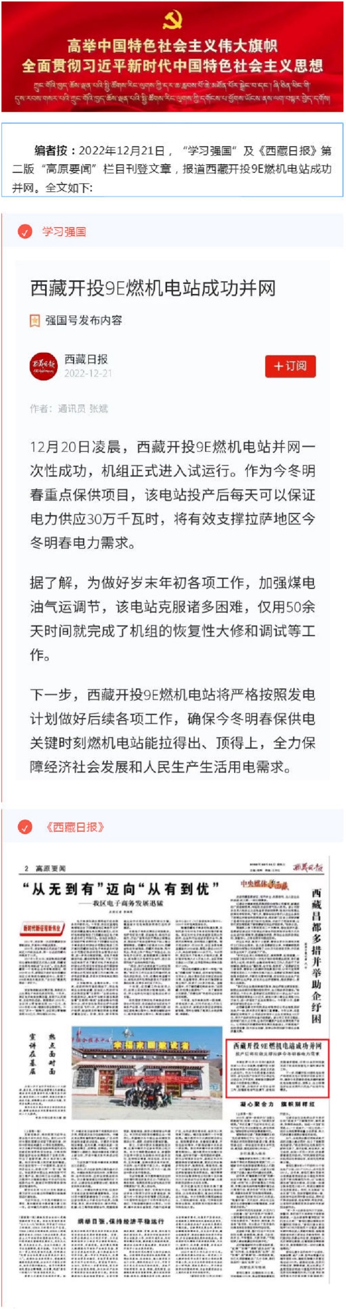 “學(xué)習(xí)強(qiáng)國”、《西藏日?qǐng)?bào)》報(bào)道西藏開投9E燃機(jī)電站成功并網(wǎng)