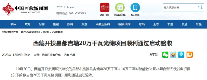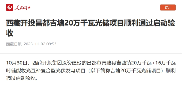 人民網(wǎng)、中國西藏新聞網(wǎng)、西藏日報(bào)客戶端報(bào)道了《西藏開投昌都吉塘20萬千瓦光儲(chǔ)項(xiàng)目順利通過啟動(dòng)驗(yàn)收》