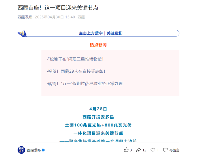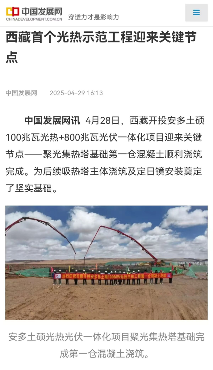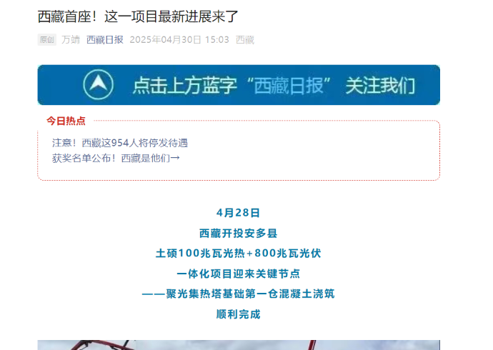 媒體報(bào)道丨西藏首個(gè)光熱示范工程迎來(lái)關(guān)鍵節(jié)點(diǎn)