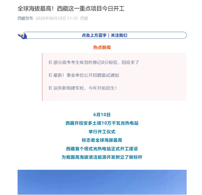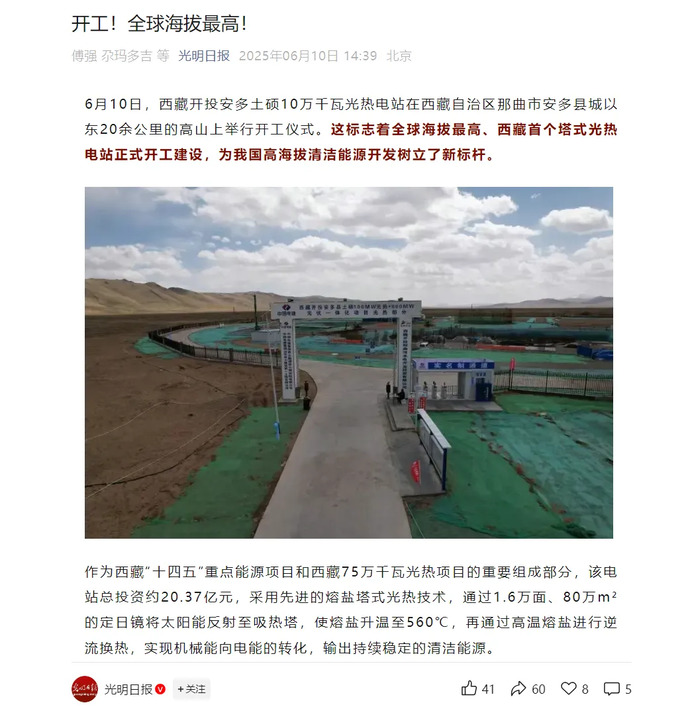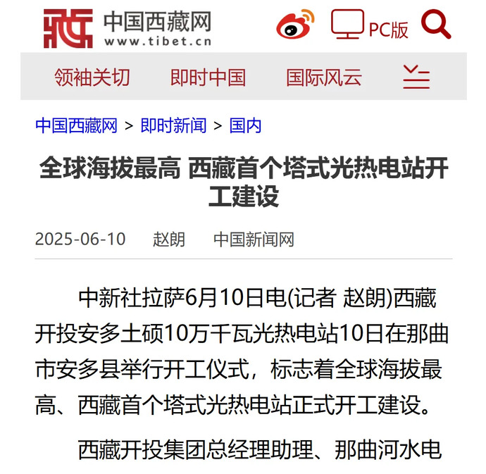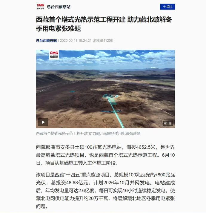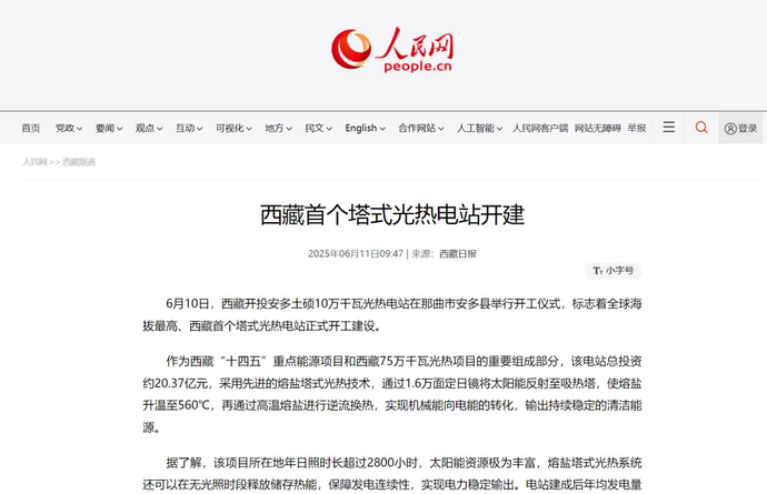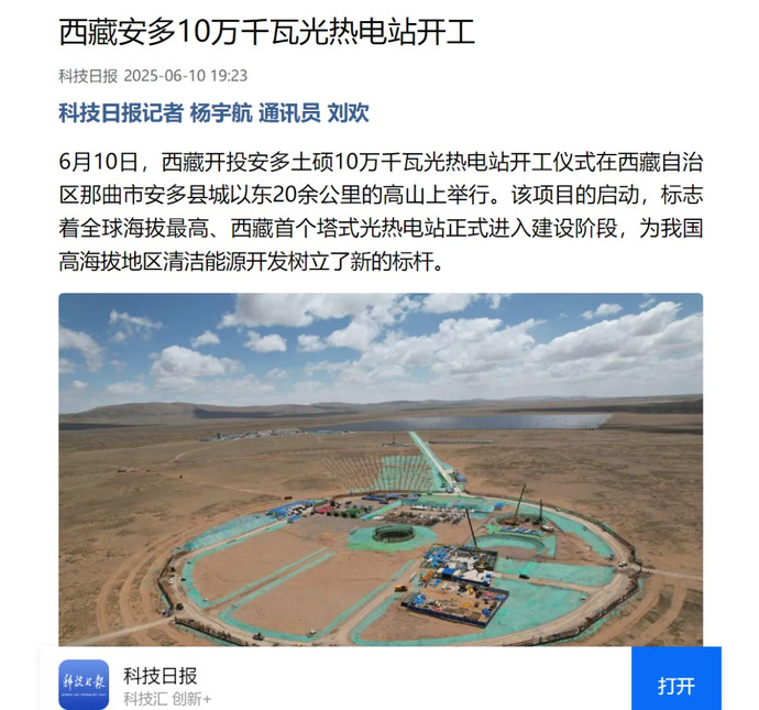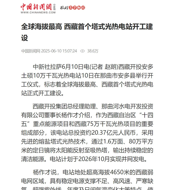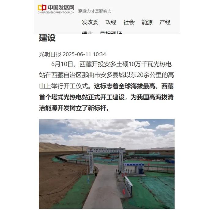 媒體報道丨全球海拔最高、西藏首個塔式光熱電站開工建設(shè)