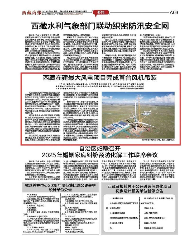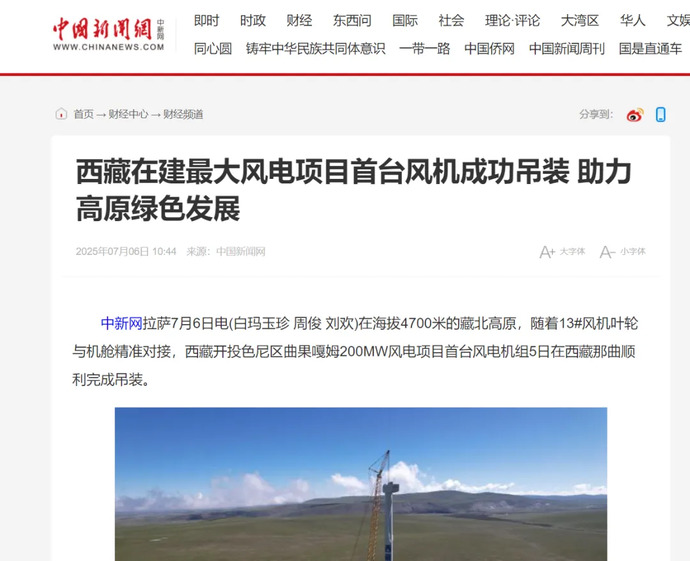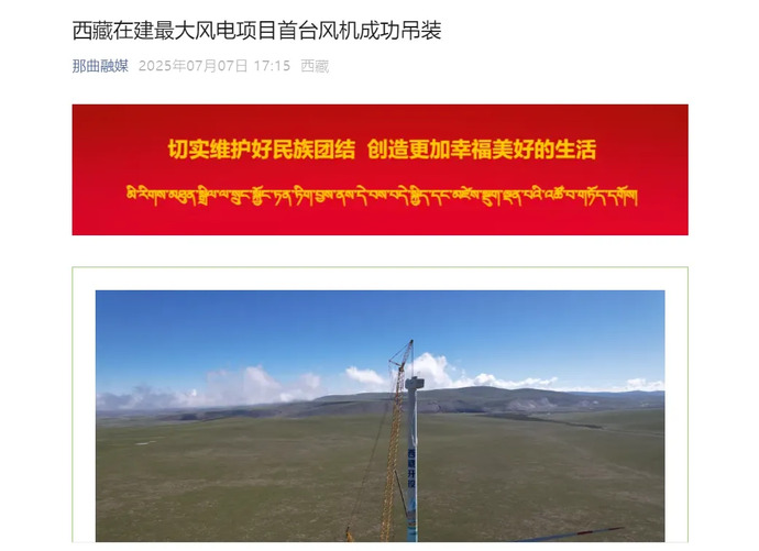 媒體報道丨西藏在建最大風電項目完成首臺風力發(fā)電機組吊裝