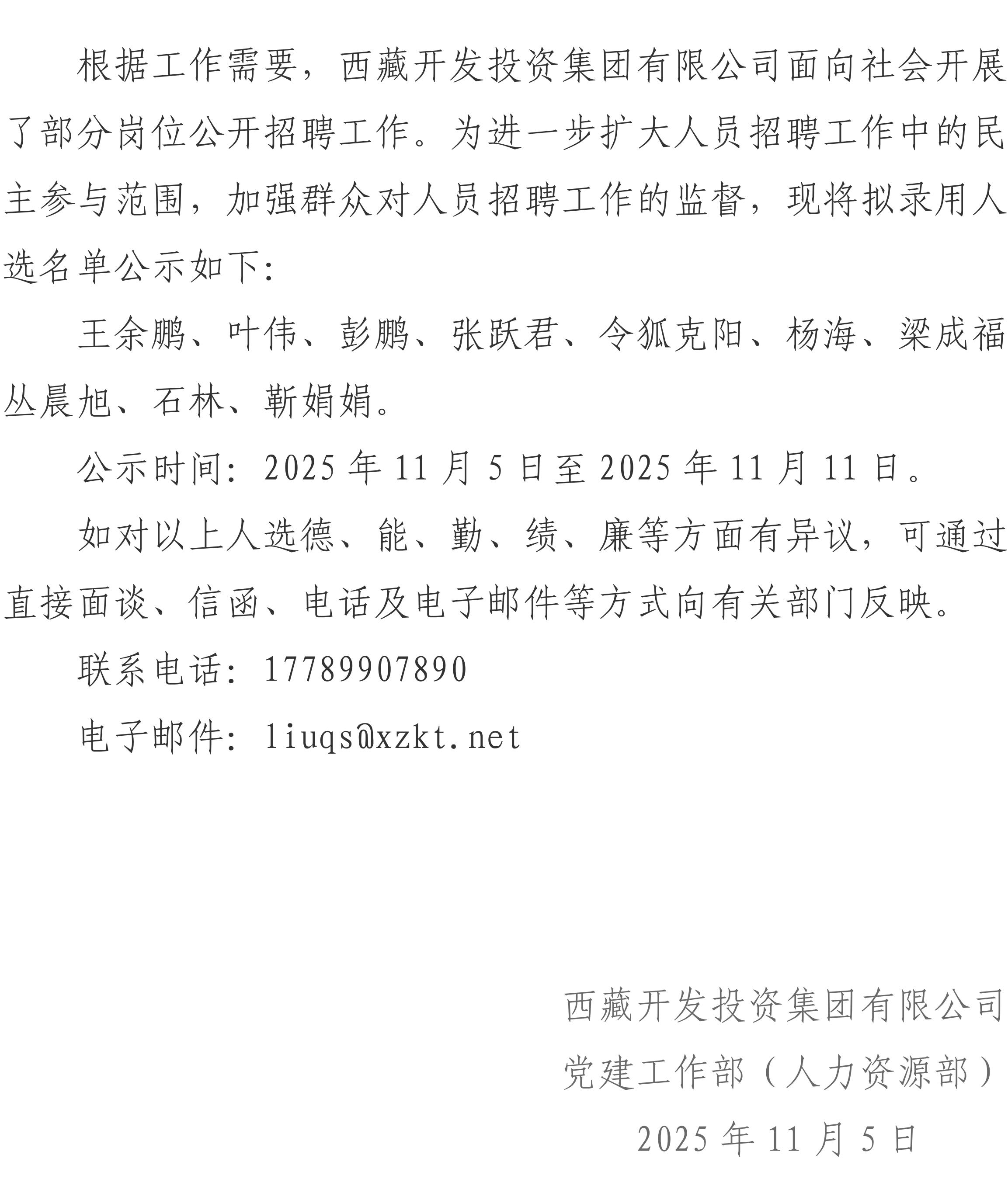 西藏開(kāi)發(fā)投資集團(tuán)有限公司2025年滾動(dòng)招聘擬錄用人員公示