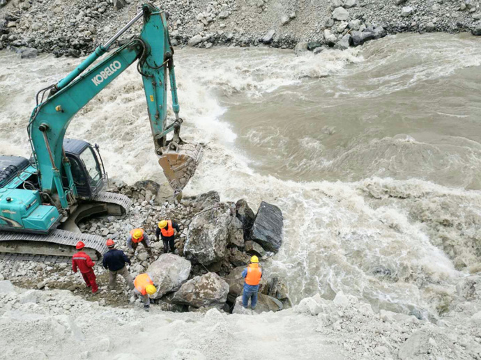 7月4日受持續(xù)強降雨影響,易貢藏布河水暴漲,7月5日凌晨5時,金橋水電站壩前水位達到3412.86米,施工區(qū)水流量達到647 m3/s。24小時后,壩前水位3412.03米,已建成的右岸壩段及在建的左岸壩段因為質量把控到位、施工組織及防洪措施到位,經受住了洪水的考驗;但是從嘉黎縣至金橋水電站施工現(xiàn)場的100公里公路有19處路段出現(xiàn)不同程度損毀,其中3處路段完全中斷,沖毀路段約5公里,路基、堡坎垮塌約2公里,金橋水電站主要建材物資暫時停運,尼屋鄉(xiāng)2000余村民出行受阻,存在極大安全隱患,嚴重影響了受災群眾的生產生活。