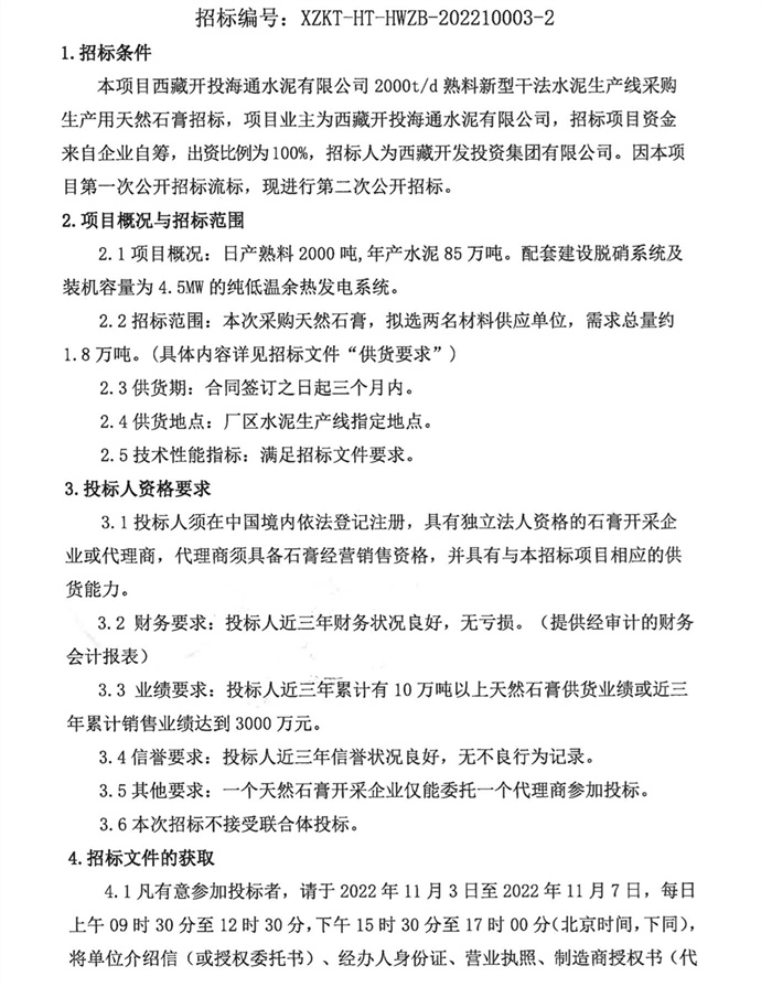 采購(gòu)生產(chǎn)用天然石膏二次招標(biāo)公告