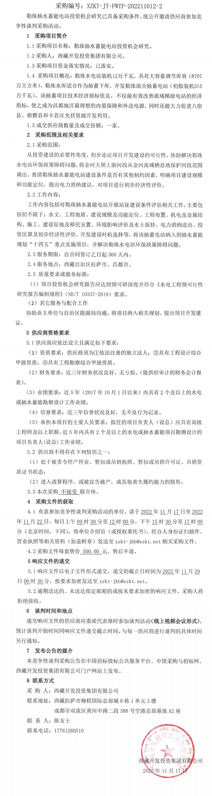勒珠抽水蓄能電站投資機(jī)會(huì)研究競(jìng)爭(zhēng)性談判采購二次公告