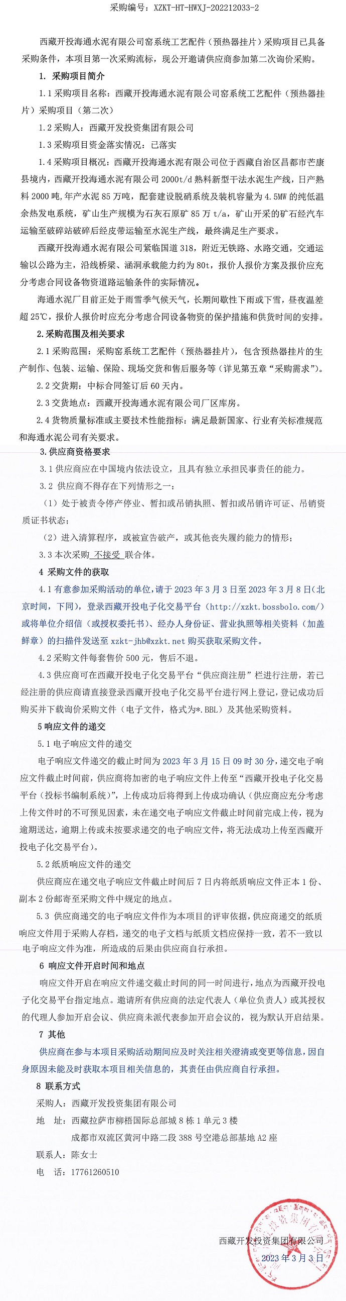 西藏開投海通水泥有限公司窯系統工藝配件(預熱器掛片)采購項目(第二次)詢價采購公告