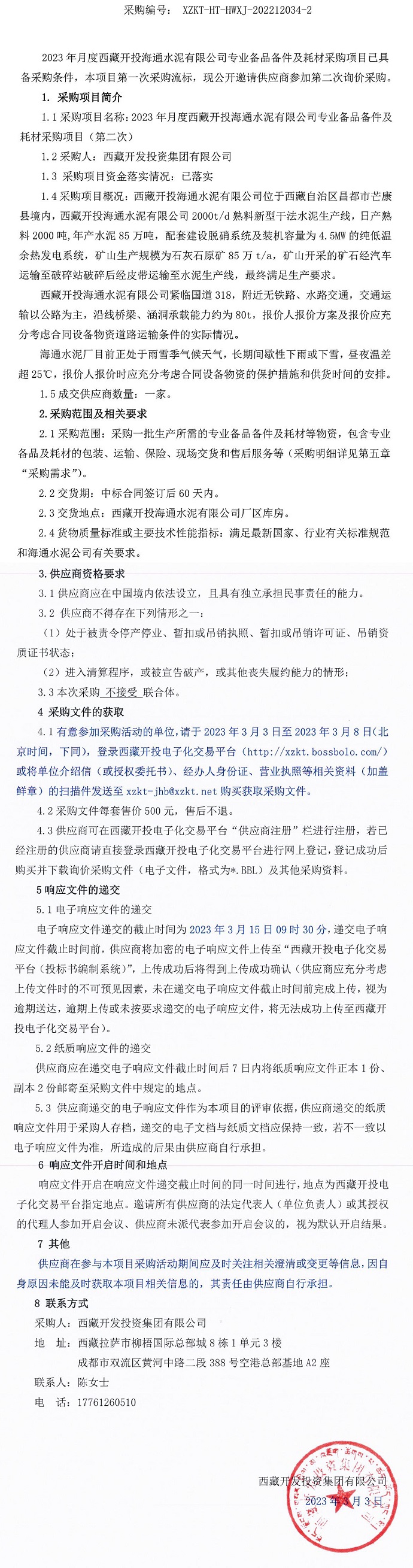 2023年月度西藏開投海通水泥有限公司專業(yè)備品備件及耗材采購項目詢價采購公告