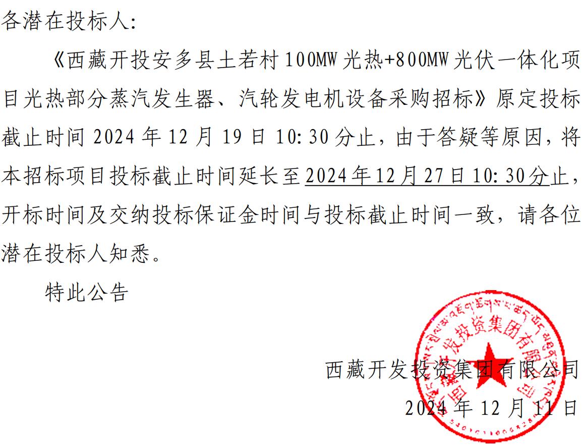 關(guān)于延長《西藏開投安多縣土碩 100MW 光熱+800MW 光伏一 體化項目光熱部分蒸汽發(fā)生器、汽輪發(fā)電機(jī)設(shè)備采購招標(biāo)》投 標(biāo)截止時間的公告