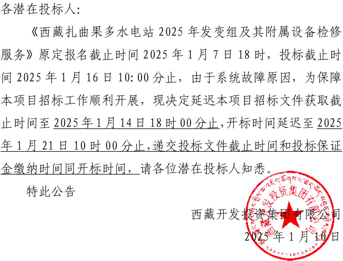 關(guān)于延長《西藏扎曲果多水電站 2025 年發(fā)變組及其附屬設(shè)備檢修服務(wù)》報(bào)名及投標(biāo)截止時間的公告