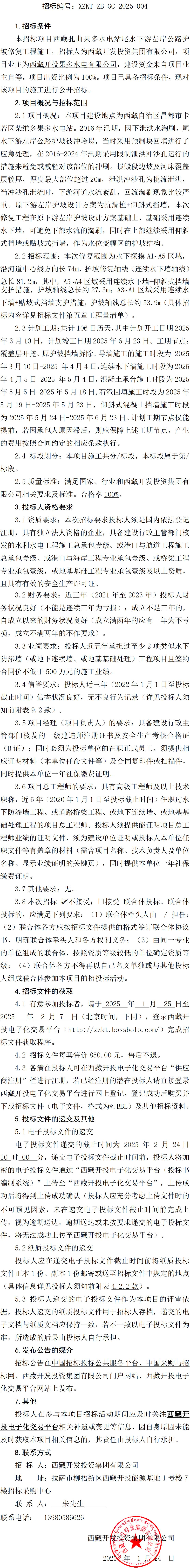 西藏扎曲果多水電站尾水下游左岸公路護坡修復(fù)工程施工招標公告