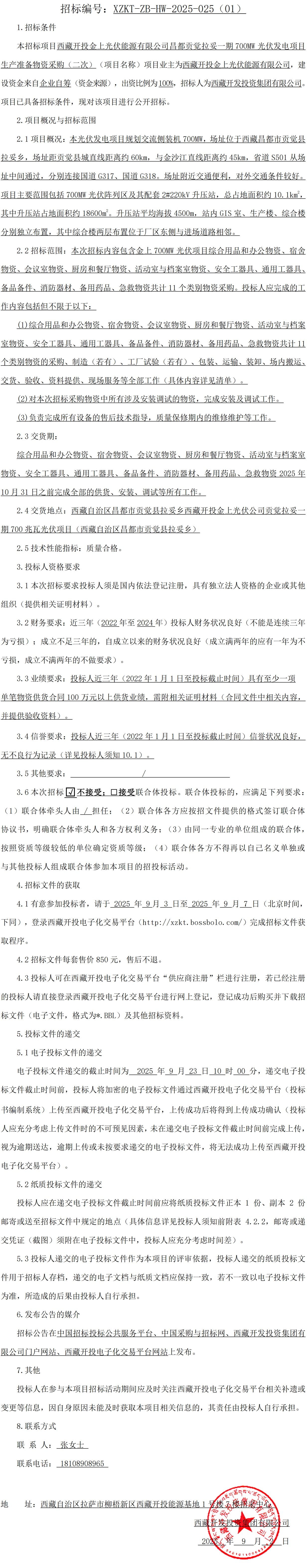 西藏開投金上光伏能源有限公司昌都貢覺拉妥一期 700MW 光伏發(fā)電項目生產(chǎn)準備物資采購(二次)招標公告