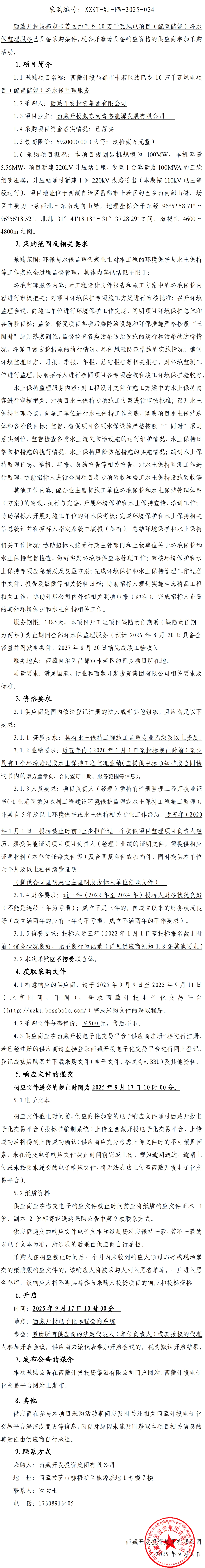 西藏開投昌都市卡若區(qū)約巴鄉(xiāng)10萬(wàn)千瓦風(fēng)電項(xiàng)目(配置儲(chǔ)能)環(huán)水保監(jiān)理服務(wù)詢比采購(gòu)公告