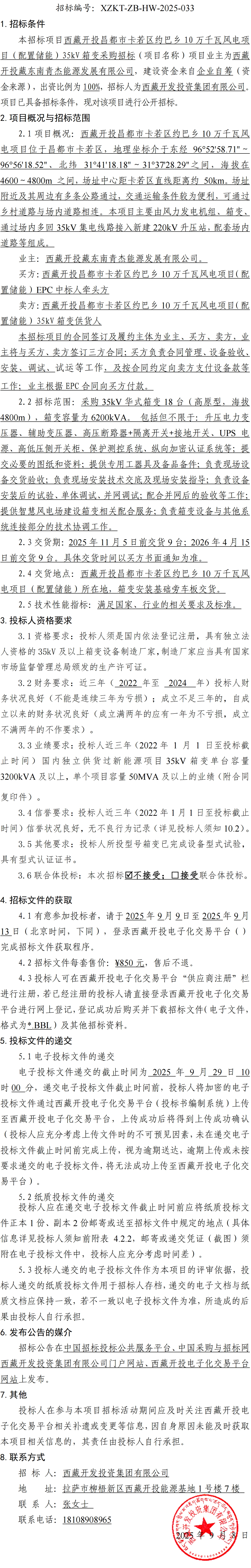 西藏開投昌都市卡若區(qū)約巴鄉(xiāng)10萬千瓦風(fēng)電項目(配置儲能)35kV 箱變采購招標(biāo)公告